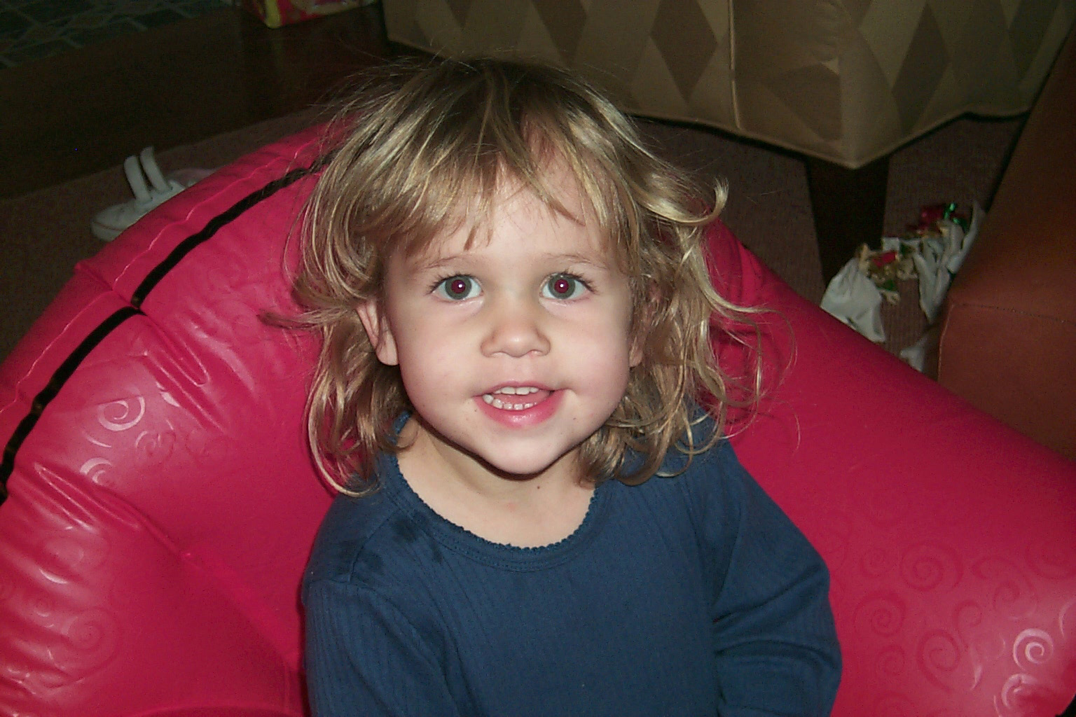 Christmas tree prior to the opening of gifts. CNatalie very happy with her new inflatable chair from Grandpa and Grandma. |