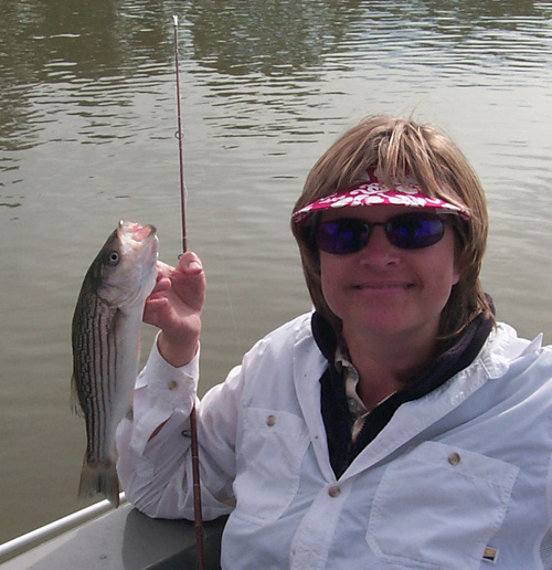 Cindy with striped Bass caught on the Napa River. Biggest fish of the trip.