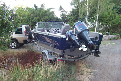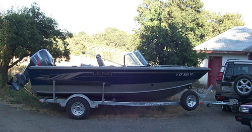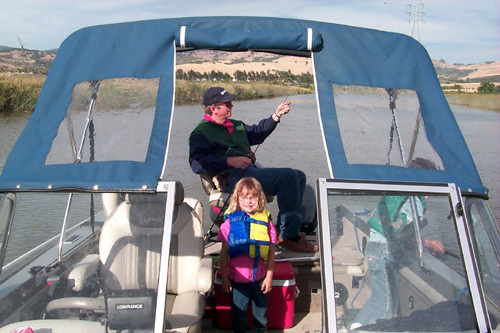 View of the boat looking forward toward a bridge over the Napa river. Lund Tyee, 18.5 ft. boat.