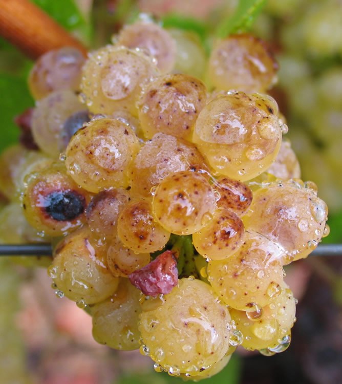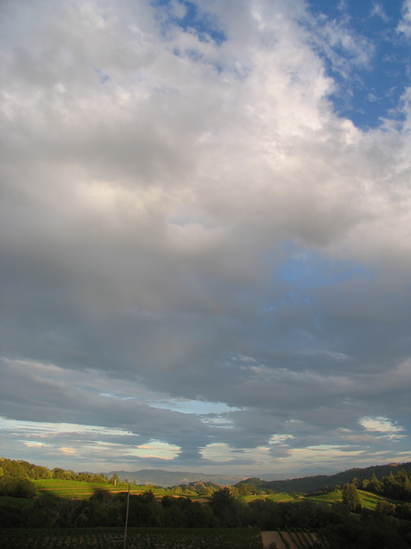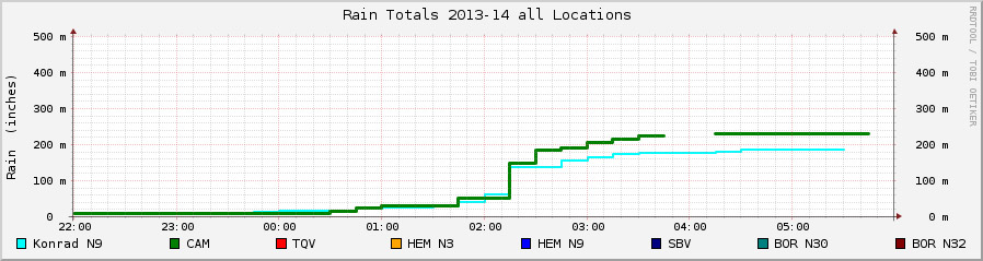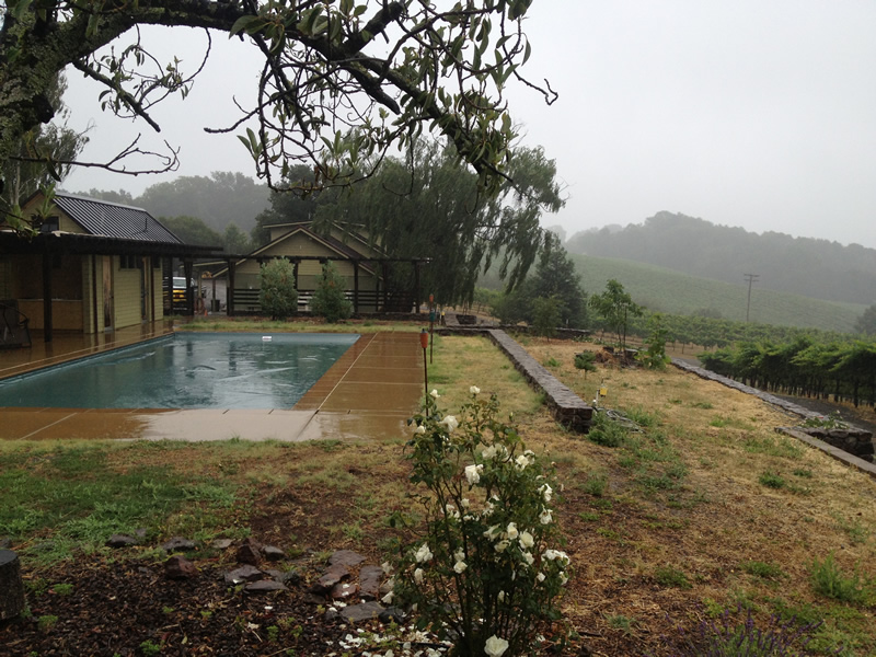 9/30/13 RAIN TOTAL 0.2" OVERNIGHT Through Noon. The grapes have been wet for 18 hours which is enough time to germinate botrytis but the temp has been only 59-65F during this time. Too cold for germination which requires 15 hours at 72F. This rain should have minimal impact on our harvest of K3L this morning. It really hasn't wet the soil significantly. We picked 1.7075 tons for David Tate from K3L in a light drizzle and had an extremely difficult time getting the truck down the hill safely. We had to chain a 4.5 ton tracked crawler to the back of the truck to provide enough braking and rear end stability to keep the truck out of the reservoir. Check out a video or two of the grape truck, grapes and crawler sledding down a very slick Mount Veeder hillside. Pardon the sound track. When you see it you gain an appreciation of the challenges we growers sometimes have to rise to. Ramon Pulido drove the truck, Miguel his first hand on the crawler kept him out of the reservoir. It will be a while before we pick in the rain at Konrad again.