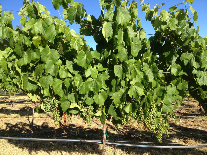 The vine growth(vigor) has been slowed sufficiently using water stress. Irrigation has been initiated. Baseline irrigation programmed into timers. 2-3 events/week, 2 gal./week total.