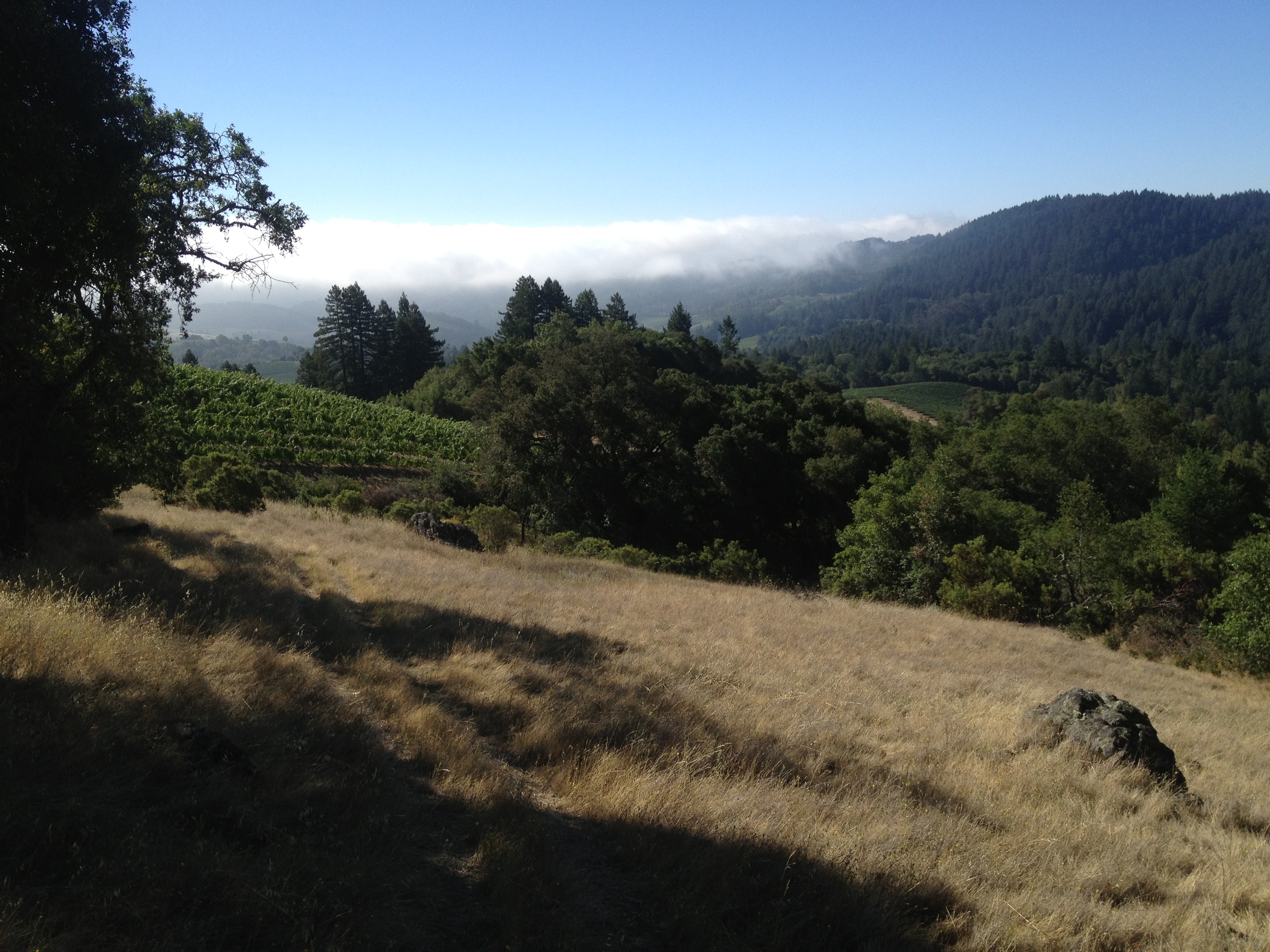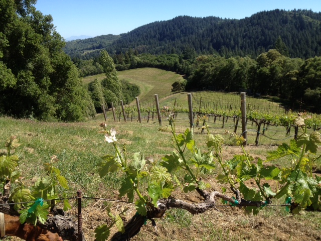 You'll notice that I have changed the title of my blog and added another vineyard to the coverage. I am now a subcontractor with Pulido Vineyard Management (PVM). PVM has increased its vineyard management to 4 vineyards this year with this addition of Crouse Vineyards AKA Mount Veeder Magic Vineyards. Crouse Vineyards are located a half mile down the gravel road from Camalie where it joins with Mount Veeder Rd. Here's a picture of the lower half of the 15 acres of vines. About 2 tons of Cabernet Sauvignon from the lower half of this block is available this year for the first time in 3 years.