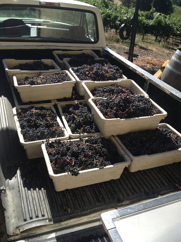 10/3/13 Picked another 4.476 tons this time from Konrad block K5. This corresponds to 3.2 tons/acre. I gave Ramon a Bill of Lading with the wrong address but a map to the right address which resulted in him taking a detour to Stag's leap before getting the fruit to Andretti winery where Jeff Ames had found a tank empty in time to take advantage of the Rubissow cancellation of their Thursday pick. We very much appreciate his scrambling to get boxes to us in time to enable us to fill in the gap in our schedule. Thanks Jeff.