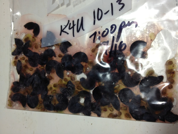 9/27/13 PICKED 4.4 TONs at KONRAD for Rob Hunter and Ryan Sherman today. Beautiful fruit and surprisingly high yield for dehydrated fruit from K4L; 3.4 tons/acre at 29.1 Brix. K4U yielded only 2.5 tons/acre a week before. Ramon took a nasty wasp sting on the leg. We're working with Jeff Ames to schedule his K5 pick now.