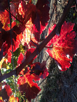 10/7/14 Harvested 1.755 tons of Merlot from Crouse block 5Merlot for Bob Kugler and All of Cr6 and Cr4upper totalling ~6.3 tons for Karen Crouse this morning. The vineyard princess herself showed up for the pick with donuts, bagels and coffee at 1:00am in the morning with no sleep. She also brought with her a full moon and a couple shooting stars. Here's a picture of her with a little more sleep on another day. Red leaves backlit with morning sunshine indicate fall is near or vines have virus. I prefer the former interpretation. These days we can send samples for DNA analysis to find out which viruses are present. Vineyard owners generally don't want to know. I like to know when I've got a strong head wind to deal with.