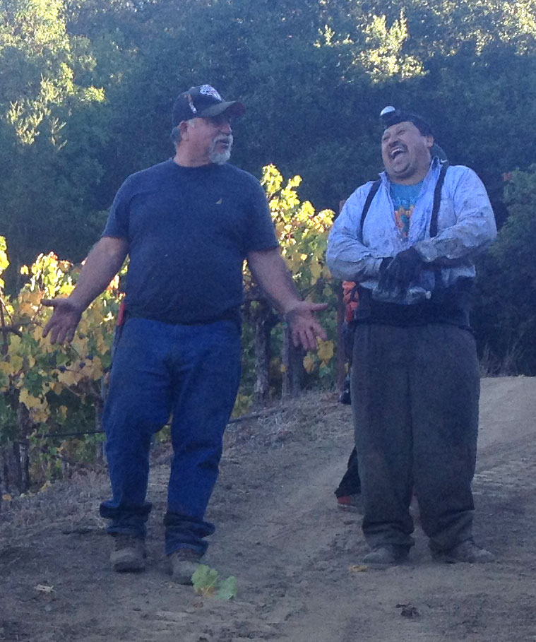 The names of these folks from left to right are ?, Louis, Umberto's wife, Umberto not shown(driving tractor at the moment), Rosio hiding with arm up, Claudia, Juan, Angele, Ezekiel AKA Checkae, Michael?, and Ramon, head of Pulido Vineyard Management. This is as good a group of people as you would ever have the opportunity to work with. We watch out for one another and work as a team which is how we stay safe, pick tons of grapes and have some fun at the same time.