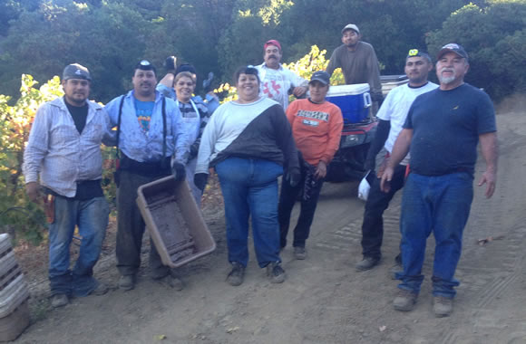 Here is Ramon at right and his crew of 9 harvesting professionals this morning. The smiles are because this was just at the end of picking 8 tons of grapes at Crouse Vineyards. To give you an idea how many grapes that is per person keep in mind that one guy pretty much drives the tractor and another dumps lugs full of grapes into the big bins and picks out MOG. In other words each person picking literally picked a ton of grapes. Well how much is that? Well each lug like the one you see Louis holding holds about 30 lbs of grapes. Divide that into 2000 lbs and you get 66 lugs a piece. To boil it down even further keep in mind that each bunch of grapes weighs about 1/3 lb. which means each lug contains about 90 bunches of grapes. Multiply that by 66 lugs and you see that they each picked about 6000 bunches of grapes this morning for a total of of 50,000 bunches of grapes by the whole group. I don't even want to think about how many bunches of grapes we must have picked in the last week.