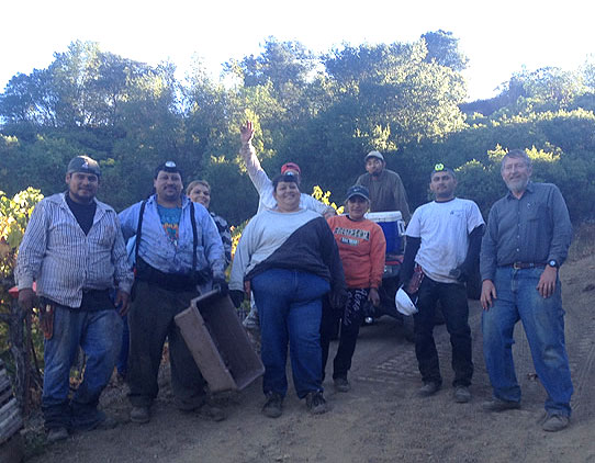 10/16/14 Picked 1.381 tons of Cab for Adam Webb and ~3 tons of cab for David Tate from Crouse Block 3 in a marathon 10 hour pick due to 3 people not showing up and wasp stings in the first row picked. This was the second to the last pick. Quote Ramon Pulido "We've got to find a better way to make a living." The low point mentally and physically in growing occurs somewhere about 3/4 through the harvest process. I'm done but Ramon still has a ton and a half of cab Franc to bring in from Rubissow.