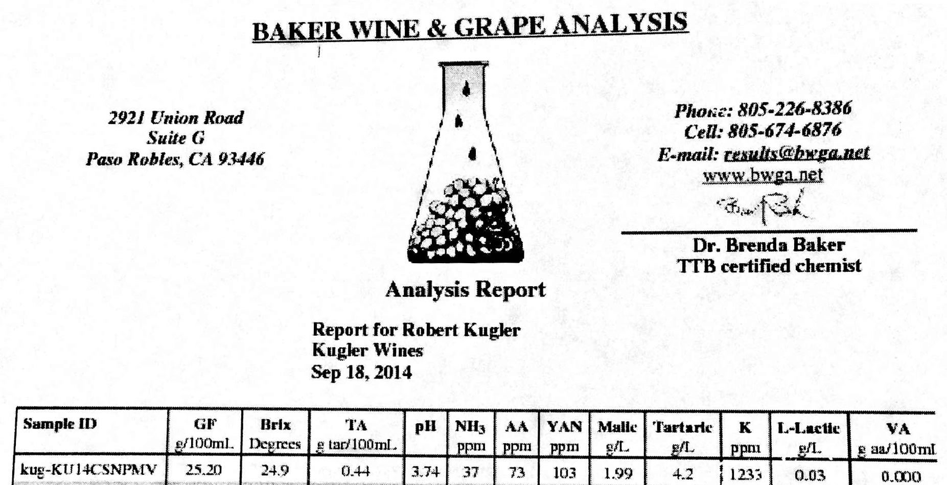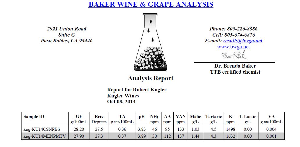 Here's Bob Kugler share of the lab report on his Crouse Block 5 Merlot. The Merlot is the 2nd row of the table. Numbers all look solid this year.