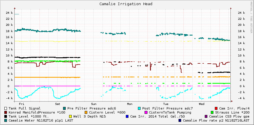 Lot's of irrigation maintenance and upgrades done to get this working. Installed two new ultrasonic tank level monitors, installed 2 new low pressure timer valves at Crouse block 7 where the head pressure is very low. Replaced 20 ft. of rat chewed black hose in the solar powered siphon primer tank fill system at the Konrad Pond. Still need to replace or install three wireless water meter monitors and a wireless pump control. The new Camalie Networks CS3 system is working phenomenally with impressive range even through the forest and a cost half that of the prior generation.
