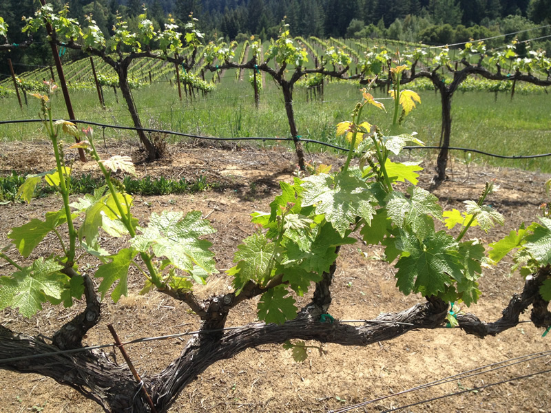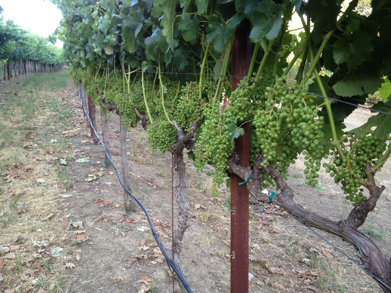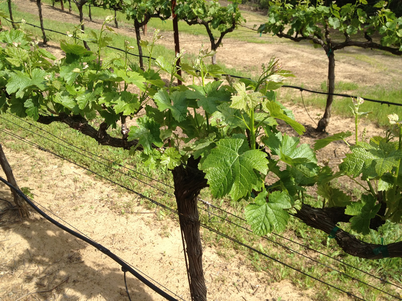 The vines have slowed their shoot growth due to most of the soil moisture stored in the soil from last winter being used up now. I have started baseline irrigation of a gallon or two per week at this point. This water is applied in two to three doses per week during the night by irrigation timers.