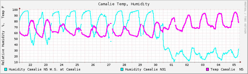Hot but more importantly dry weather over the last 5 days is advancing ripeness and bringing sugars up both by maturation and dehydration. The humidity change is especially abrupt as shown on the curve below. Also not the Mount Veeder inversion layer weather. Night time temps havn't been below 65 degrees for 5 days. I think this must enable metabolism to continue at night. This unusual twist will likely contribute to the uniqueness of this vintage.