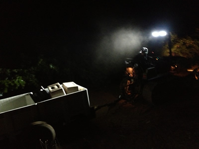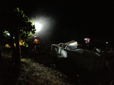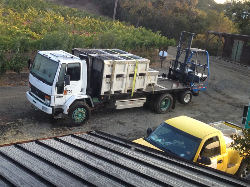 10/14/14 Picked 5.09 tons at Camalie for Franciscan this morning before 5:00am. The cold front came in as we were eating buritos for breakfast. Looks like we will do a total of 25 days of picking with picks for two different customers on many days. Fifteen different customers delivered to. Total around 100 tons of fruit. Yield numbers all very close to last year, quality better than last year.