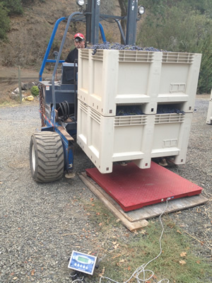 | Hunter | K2UW | .55 | .976 | 2.6 tons/acre 6.0 lbs/vine | Partial Block Pick | Friday 9/26/14 Picked | Friday 9/27/13 | Hunter Farms, Arnold Dr. Sonoma | Hunter boxes 2 | has scale and Forklift | |