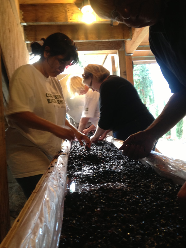 10/4/14 Harvested 0.613 tons of Cabernet Sauvignon from Camalie Vineyards for my home winemaking, and crushed it. 25.9 Brix initially in the tank and 26.3 the morning after. Looks good. Enjoyable harvest party with 25 people showing up and all doing their part, picking grapes and crushing/picking jacks.