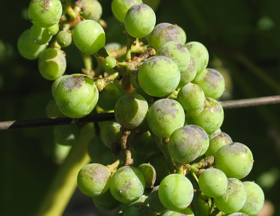 Here is a closer look. This mildew is dead. The mildew is the white dusting on the grapes. The brown speckling is a side effect of the mildew that can be seen on the canes as well as the grapes. It will be hard to see after the grapes change color. Ramon has scheduled another pass over K1 to drop mildewed fruit and fruit out of the main maturity distribution or excessively crowded.