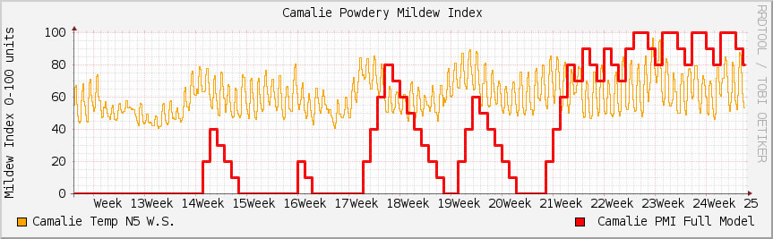 6/21/14 MILDEW BATTLE. With the larger than average canopies and near ideal weather conditions for powdery mildew we have increased our spray frequency switched to synthetic fungicide and are pulling leaves at a rapid rate. Below you can see the powdery mildew index. We are observing a berry or two with signs of powdery mildew here and there but, no major outbreak so far.