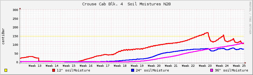 Below is a new wireless/ultrasonic pond level sensor by Camalie Networks deployed at the Crouse pond. I installed one in the Konrad pond as well to monitor for siphon faults. Our water situation is still looking good with the Crouse pond yielding more water after the leak fix last winter. Still need to automate the filling of the tank from the pond. We use a tank of water, 5K gallons, every two days now. Which requires a trip to the pump. Made some adjustments to the irrigation times. Less water to the block 8 Merlot and more to Blocks 5 and 6. No water to Bachus which is looking really good.