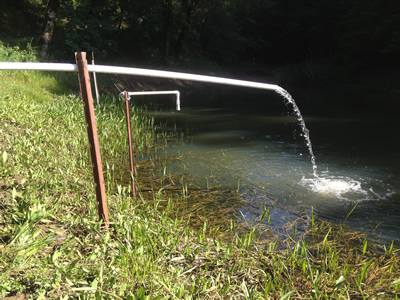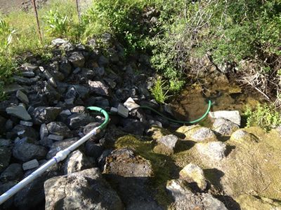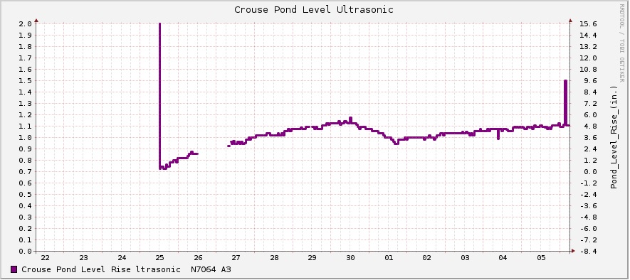 I also installed a water recovery pump at Crouse vineyards and a pond level sensor there. The water recovery pump might also be called a reverse bilge pump. A bilge pump is used in boats to pump water out that leaks in. If you think of the reservoir as the hull of a boat which has leaking water out rather than in then the pump outside the reservoir shown in the first picture below can be thought of as a reverse bilge pump. The water is on the outside of the hull and we want it back in. This probably seems like a brute force alternative to fixing the leak but, we have already spent a couple thousand dollars trying to fix the leak without success. There is a reason why this approah is common in boats and ships, leaks are hard to fix especially when the leakage is distributed over a large area which is the case here. You can see the new pond level sensor in the picture on the right too along with the outflow from the new pump. You can see the leak rate between the 30th of April and the First of May when the pump was turned off for a day. In addition to leakage from the reservoir going into the sump there is also spring water from the hillside to the East filling the sump hence the net rise in the pond level. The water in the sump is ice cold and crystal clear. The pond level has risen 5" since we started the pumping whereas it would have lost 10" if we weren't pumping. This puts us around 50,000 gallons ahead of where we would have been without the pump. Sometimes reality serves up a bonus, but not too often.
