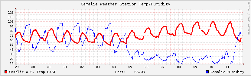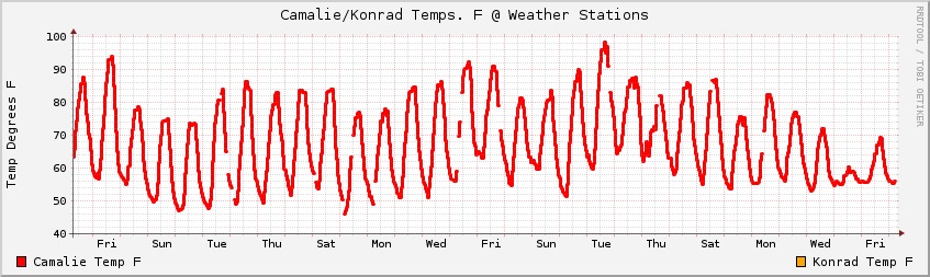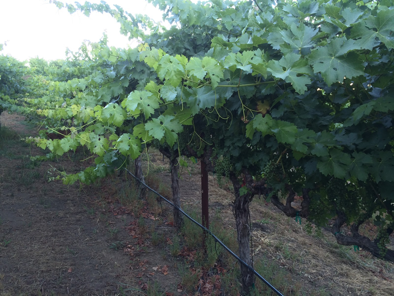 7/9/15 RAIN in July?? Barely enought to wet the ground. The rain gauge says we got only .06". The temperature has also been low with a high of only 60F during the rain. It felt like winter. This is good news in a drought though. Both the moisture and low temps reduce vine evapotranspiration significantly and will reduce the amount of irrigation we need to do.