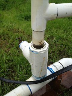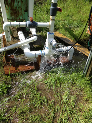 The next day after repairing the joint I resumed pumping and fertigated blocks 3 and 4 at Crouse but, as I was filling the tank to start fertigating block 5 a different joint in the manifold came apart with similar cause and effect. O.K. guys this is no longer funny. This is what happens when a high powered executive decides to take up plumbing. This 3" plumbing operates at 105psi to convey water 250 ft. up to the top of the hill. The cross sectional area of the pipe is 7 sq. inches times 105 pounds/sq. inch = 740 lbs of force on each joint. It's amazing that plastic pipe can handle this pressure at all. You can see why anything less than perfect joinery will fail. There are another three "executive" joints that are still holding but, I now have spare parts on hand to replace them if need be. Water cost per break is a couple thousand gallons as the whole tank empties before I can reach the shut off valve under the plank next to the wet power panel. Whine complete.