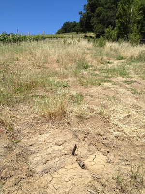 When this valve at the top of block K6 was opened no water flowed because the water supply was shut off at the main manifold next to block K1. They left this valve open and drove the crawler up to the manifold where there is another fill line. They opened the main valve at the manifold and filled the sprayer there. When they opened the main valve the vineyard main was pressurized and water began flowing through the valve left open at K6 and out of two sheard off 1/2" risers at the edge of the abandoned block. They did not notice this flow as they were roughly 200 yards away at the main valve out of site of the area where the water was flowing from the risers. They finished their spraying and left the vineyard in vehicles that made too much noise to hear the water flow. The water flow was 100 ft. from the road and out of site of the road they exited on. They weren't planning on returning until the next spray time and since we are not yet irrigating there I had no plans to go there either. Ramon left for L.A. a couple days later to visit his brother in the hospital. Ramon is back there again for his funeral today 4/22/15. It was 11 days before our neighbor Mario managing the adjacent vineyards at Domaine Chandon noticed their reservoir more full than it had been and came to investigate. He found the source of the water flow, shut off the main valve at Konrad Vineyards and called us saving us from complete disaster. Thanks so much Mario!!