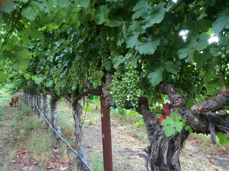 Below you can see the top 5-6 vines in Konrad vineyard struggling with the heat and limited water. Further downhill though the vines are doing O.K. Pan your browser to the right to see.