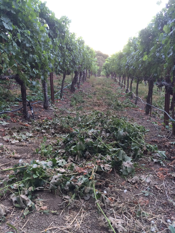 7/6/15 HEDGING. Below is Camalie Block 4 in need of some hedging. No irrigation or fertigation to this block. I believe the light crop load has resulted in more canopy growth. This is one of the more vigorous blocks most years. With the lighter crop load the vines don't need this much canopy. Hedging removes the shoot tips where most of the vines' energy is being spent. We want more of it to go to the grapes although with the light crop load we are not too worried about getting all the fruit to ripen. We would like to get more sun on the fruit though, another reason for hedging.