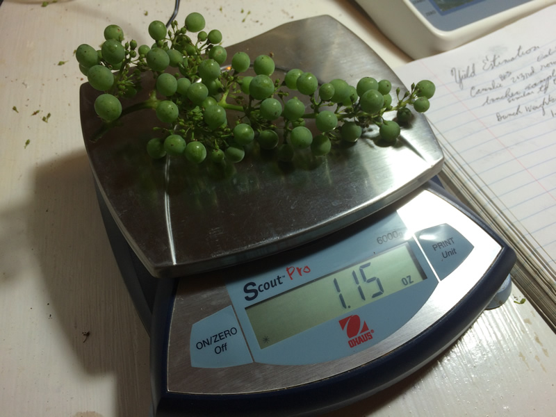 7/14/15 YIELD ESTIMATE = 1/2 PRIOR TWO YEARS. Ms. Crouse is in the final stages of working out a contract with her winemaker and asked me to do a more precise yield estimate than the qualitative visual assessment we have been doing thus far. Since the yield this year appears to be very far from the norm this is a worthwhile action for the purpose of winery capacity planning. Using last year's numbers or the estimates in the grape contracts will likely result in some half empty tanks at crush.