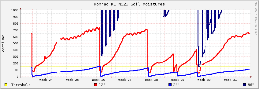 Below is a graph of the soil moisture tension in Konrad Block K1. Here you can see we have been able to keep the soil moisture under the 150 centibar target with the help of water from DC.