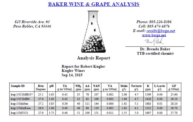 Bob Kugler's juice data from 8/29/15, two blocks of fruit at Crouse Vineyards and the Konrad Malbec as well as some Beckstoffer blocks.