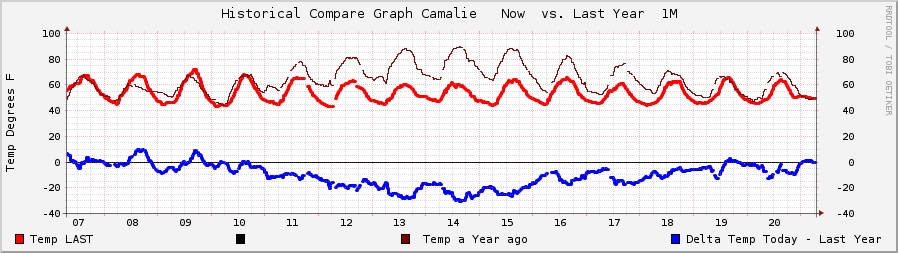 5/19/15 COLD weather. Bloom is mostly done but, is dragging out due to the cold weather. Below is an interesting graph showing the temperature difference between last year this time and this year. You can see that we had most of a week of warm temps last year at this time vs. temps as much as 30 degrees cooler this year at the same time. The blue curve is the difference in temps.