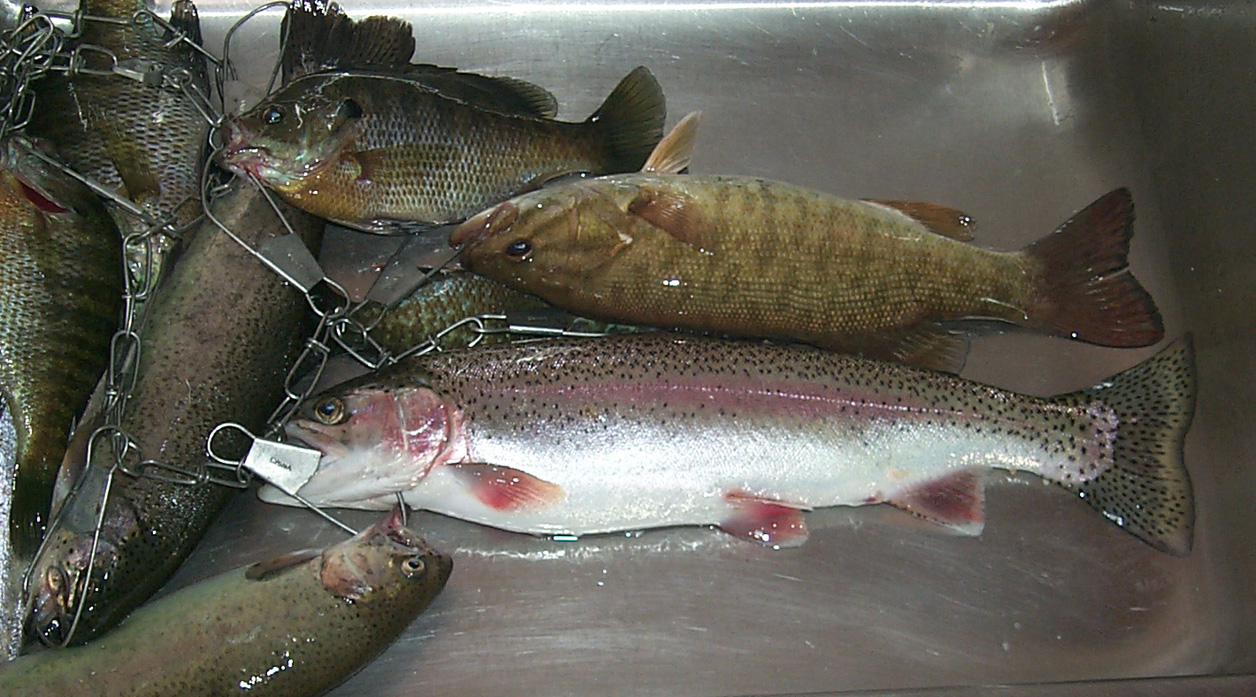 Below is a big (15") Small Mouth Bass Cameron caught on our summer vacation 2000 in Wisconsin. He had to use all his strength to pull this one into the boat.