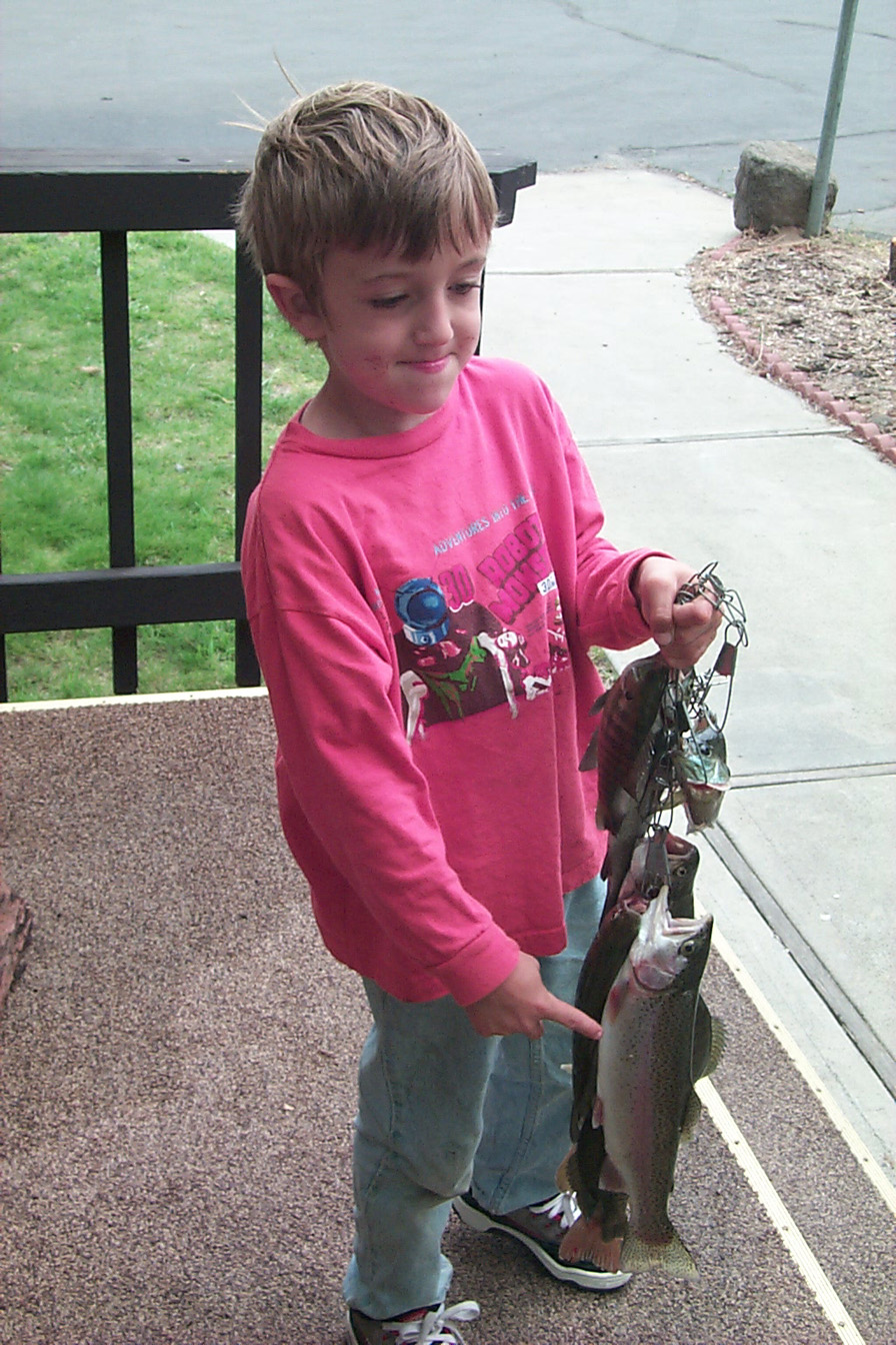 Here is Cameron with the Biggest fish we caught on our lake Tulloch Trip. He caught this big Rainbow trout and was quite proud of the accomplishment as you can see. We went there in early October 2000.