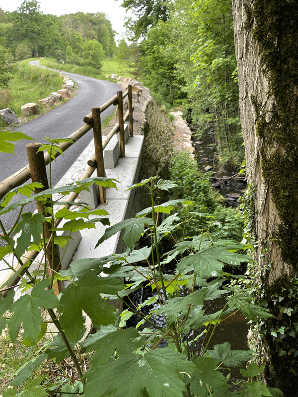 This road is actually a dam which has the ability to block the stream and form a lake to the left as has been done in the past. At the moment the gate below the bridge is open allowing the stream to flow unimpeded. You can see the stream flowing away along the base of the retaining wall. On the right we are farther down the road on a morning walk through the French Countryside which now has new meaning for us. The flora here reminds me very much of where I grew up in the Midwest of the United States, Wisconsin. Very green in the spring and summer. Dairy cows, pastures, cheese! Many of the same plants and wild flowers.