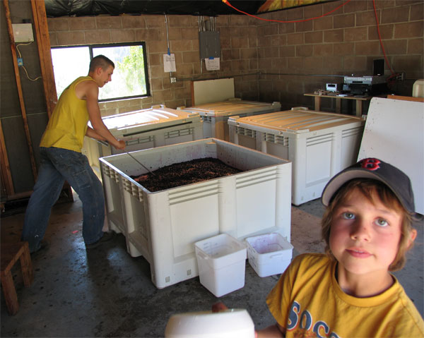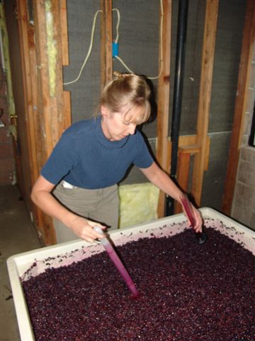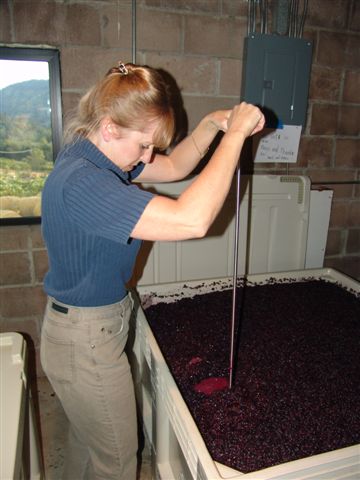 Tracy punching the must then measuring the specific gravity.